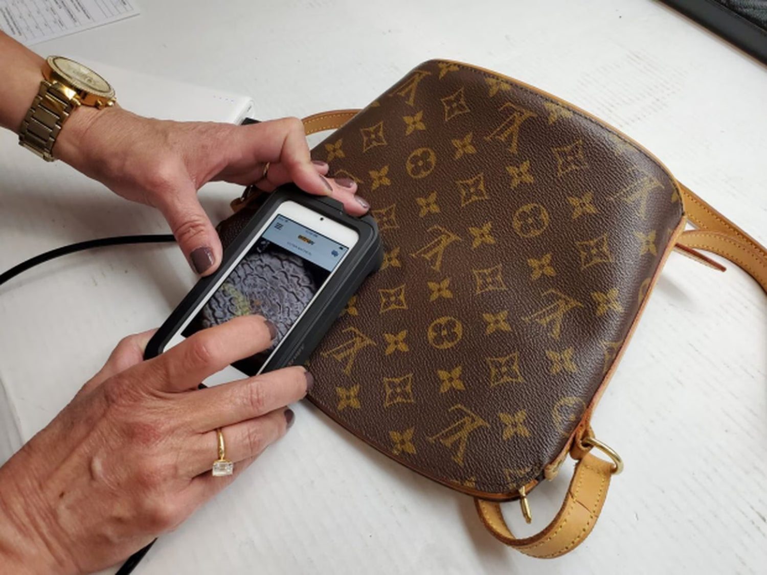 Through microscopic images of the physical product via the Entrupy device and app, they are able to identify real and counterfeit items.